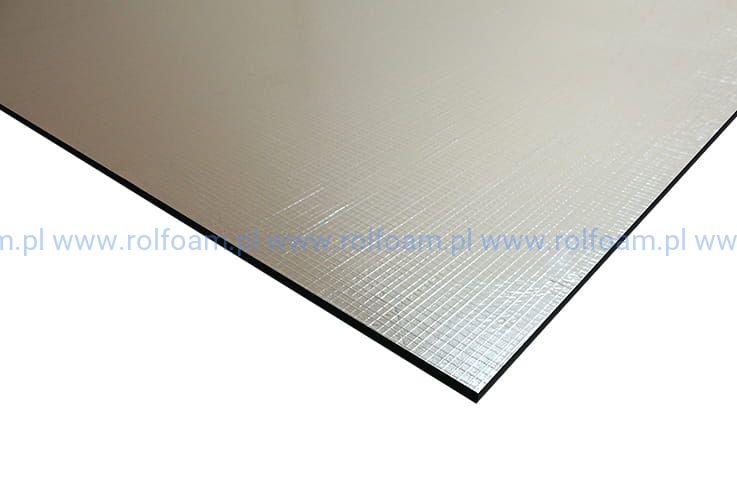 Mata wygłuszająca Rolsound EPDM ALU to laminat mikrogumy neoprenowej CR z nieprzepuszczalną, barierową, zbrojoną folią aluminiową.